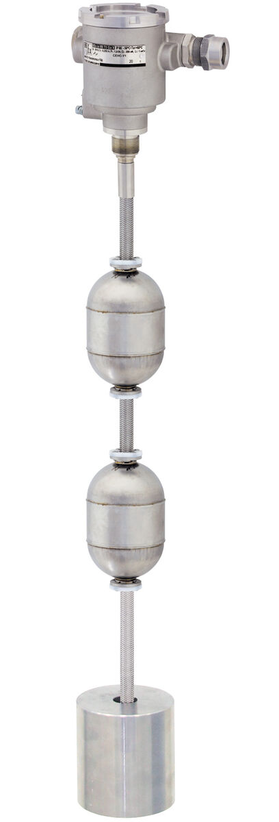 Уровнемер состоит из корпуса, соединённого с направляющей, на которой устанавливаются: устройство крепления, ограничитель хода поплавка, поплавок уровня, поплавок раздела сред (при наличии) и груз.