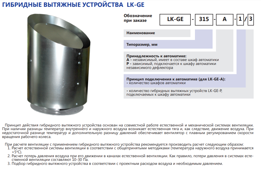 Принцип действия гибридного вытяжного устройства основан на совместной работе естественной и механической системах вентиляции. При наличии разницы температур внутреннего и наружного воздуха возникает естественная тяга и, как следствие, движение воздуха. При недостаточной разнице температур и дополнительную разницу давлений обеспечивает вентилятор с плавным регулированием скорости вращения рабочего колеса.
